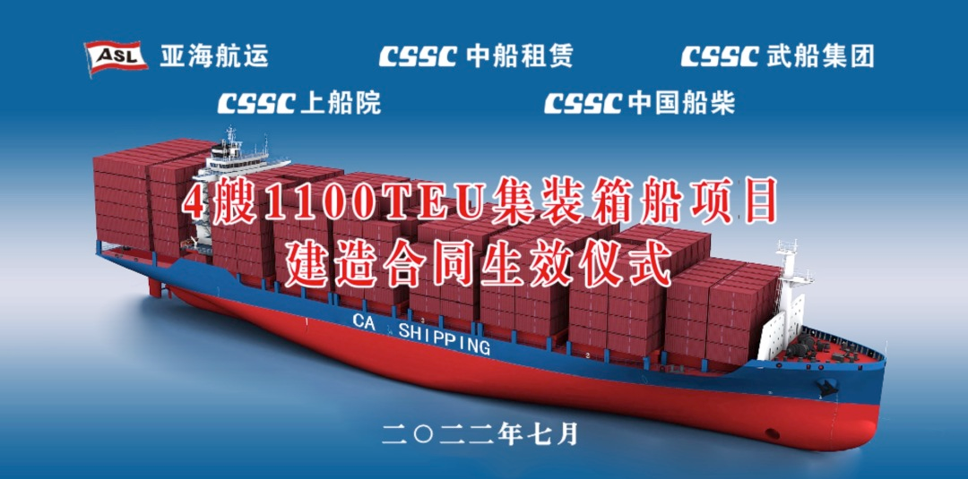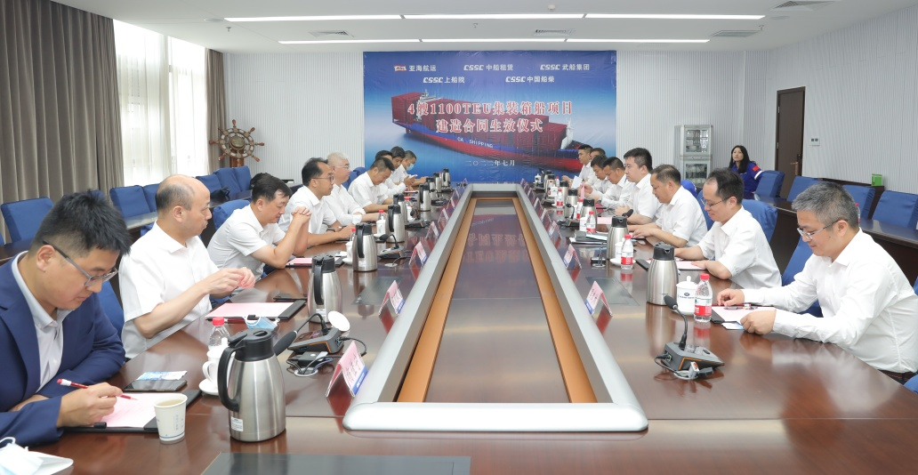 7月7日,中國船舶武船與CA SHIPPING(中船租賃和亞海航運成立的合資公司)簽署的4艘1100TEU集裝箱船項目合同生效儀式在武船總部舉行。這是公司繼此前交付的2艘700TEU集裝箱船后承接的又一支線集裝箱船訂單,為公司深耕支線集裝箱船市場,實現批量化、專業化建造奠定堅實基礎。