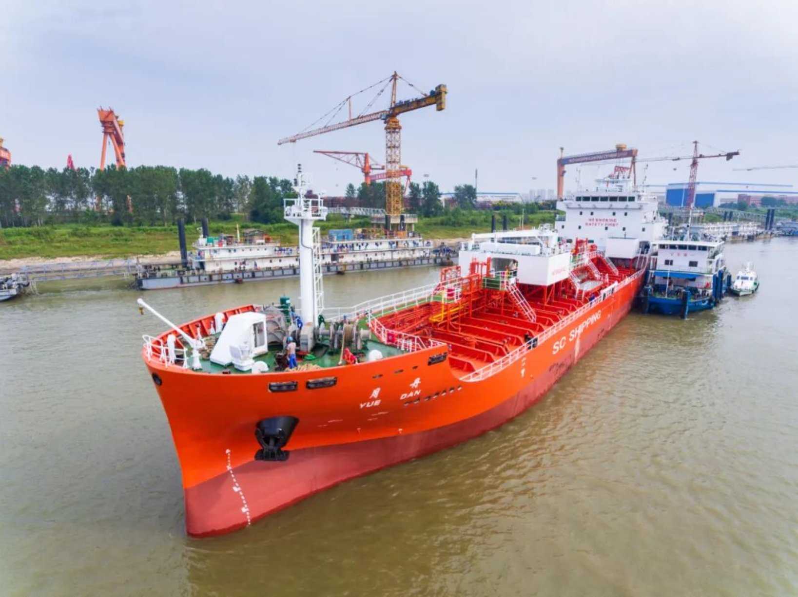 9月19日上午,由武昌造船為上海君正船務有限公司建造的 7200DWT化學品船3號船離廠,7200DWT化學品船4號船下水,不斷吹響保交船攻堅戰的勝利號角.上海君正船務有限公司監造部部長劉仁杰,武昌造船黨委委員、副總經理田軍及相關單位人員出席下水和送船活動。