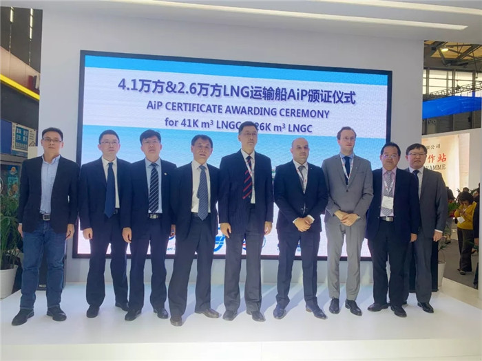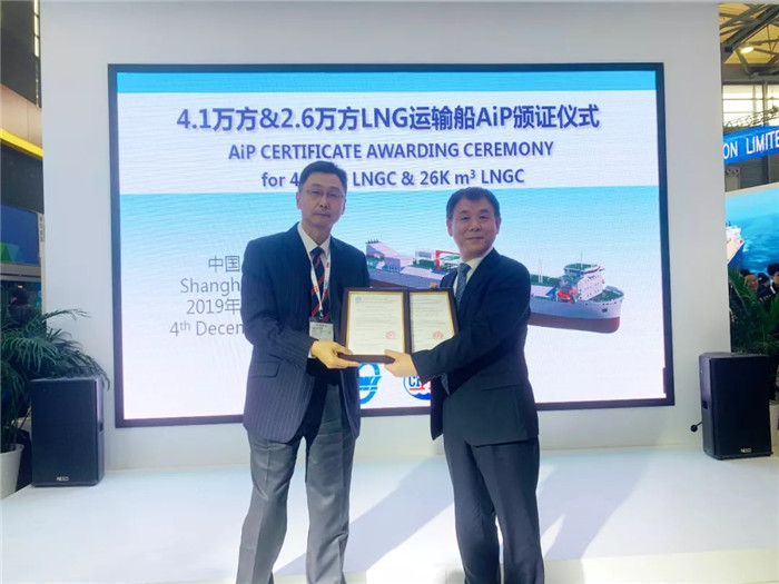 2019年12月4日,在第20屆中國國際海事展上,海工院研發(fā)的26000/41000立方米進江薄膜型LNG運輸船獲得了中國船級社(CCS)頒發(fā)的AiP認可證書。武船集團副總經(jīng)理王渭齡代表武船集團接收證書,武船集團海工院董事長魏建平在頒證儀式上致辭,海工院副院長葉茂做船型介紹。