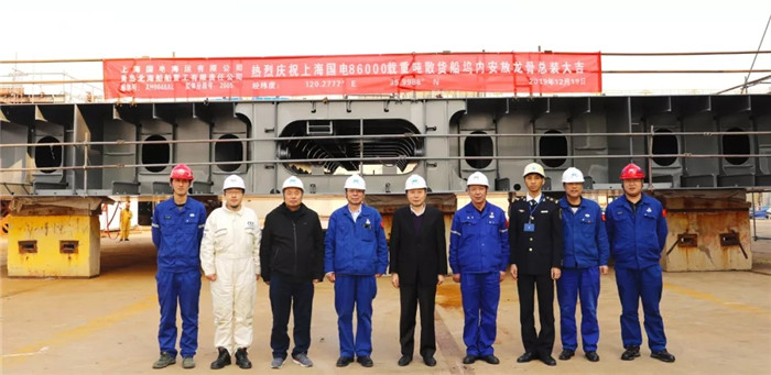 上海國(guó)電海運(yùn)有限公司副總經(jīng)理韓青、中國(guó)船級(jí)社青島分社驗(yàn)船師肖楠、青島海事局鄭文杰、北船重工副總經(jīng)理于寶月及相關(guān)部門負(fù)責(zé)人出席86000噸散貨船1、2號(hào)船鋪底儀式。