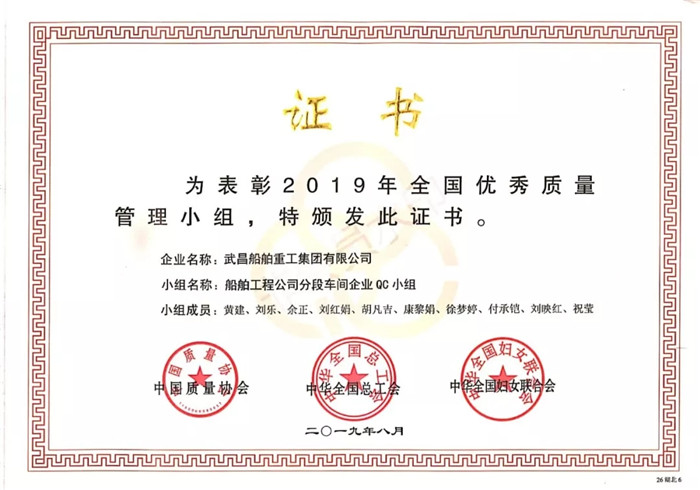 ▲船舶公司分段車間企業(yè)號(hào)QC小組獲得“2019年全國(guó)優(yōu)秀質(zhì)量管理小組”榮譽(yù)稱號(hào)