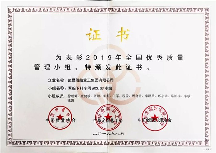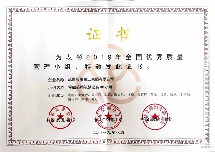▲軍船公司筑夢(mèng)遠(yuǎn)航QC小組獲得“2019年全國(guó)優(yōu)秀質(zhì)量管理小組”榮譽(yù)稱號(hào)