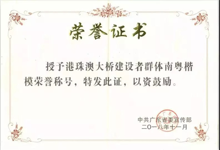 11月3日,廣東省委宣傳部授予港珠澳大橋建設者群體 “南粵楷?!狈Q號。廣東省委常委、宣傳部部長傅華出席活動,并會見了港珠澳大橋建設者代表。