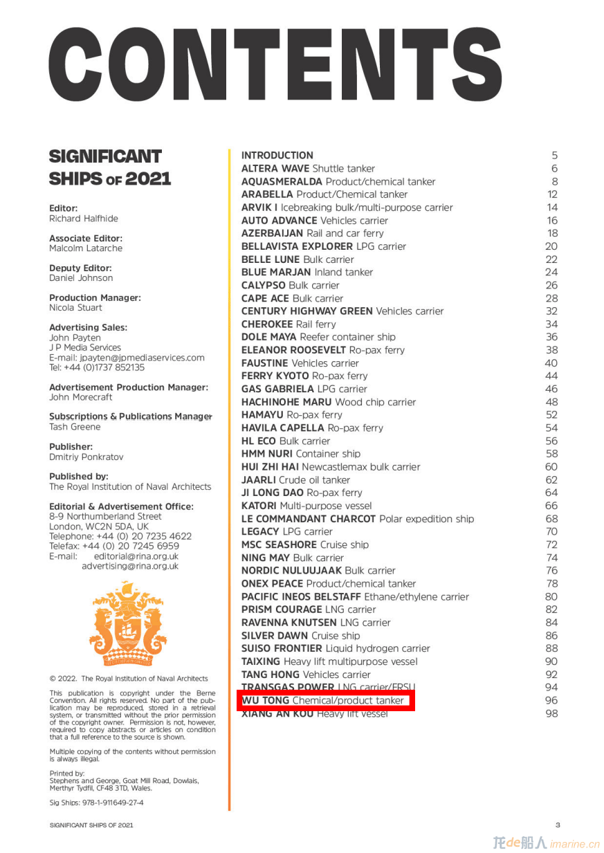 近日,英國(guó)皇家造船工程師協(xié)會(huì)發(fā)布了2021年度杰出船型名錄《SIGNIFICANT SHIPS OF 2021》,收錄了全球各船廠去年交付的43型杰出船型。其中,由中國(guó)船舶武船集團(tuán)建造的7200載重噸雙相不銹鋼化學(xué)品船“梧桐”輪榮列其中。