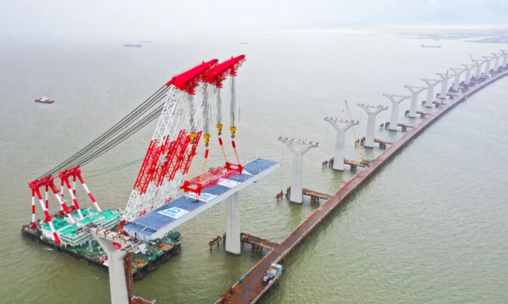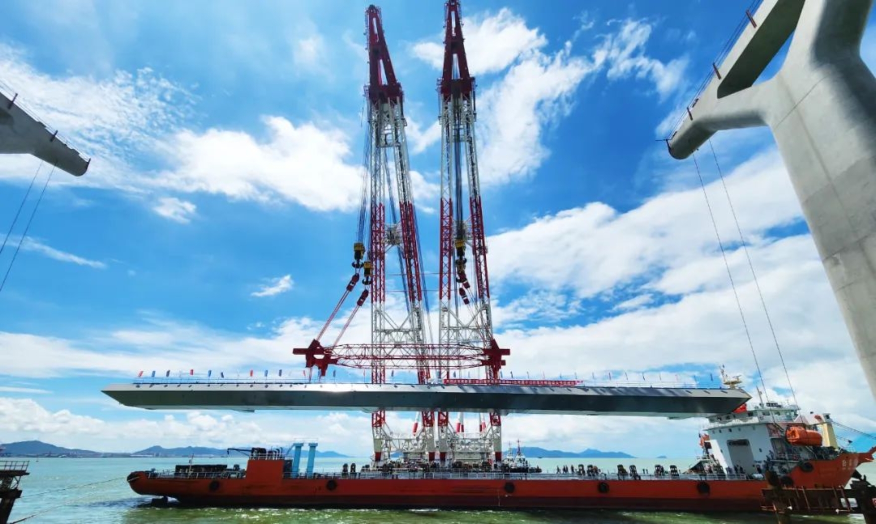 8月12日下午14時,黃茅??绾Mǖ乐幸龢蚴┕がF場,重達1340噸鋼箱梁大節段成功吊裝,標志著黃茅??绾Mǖ乐幸龢蜾撓淞捍蠊澏蔚跹b作業全面開始。