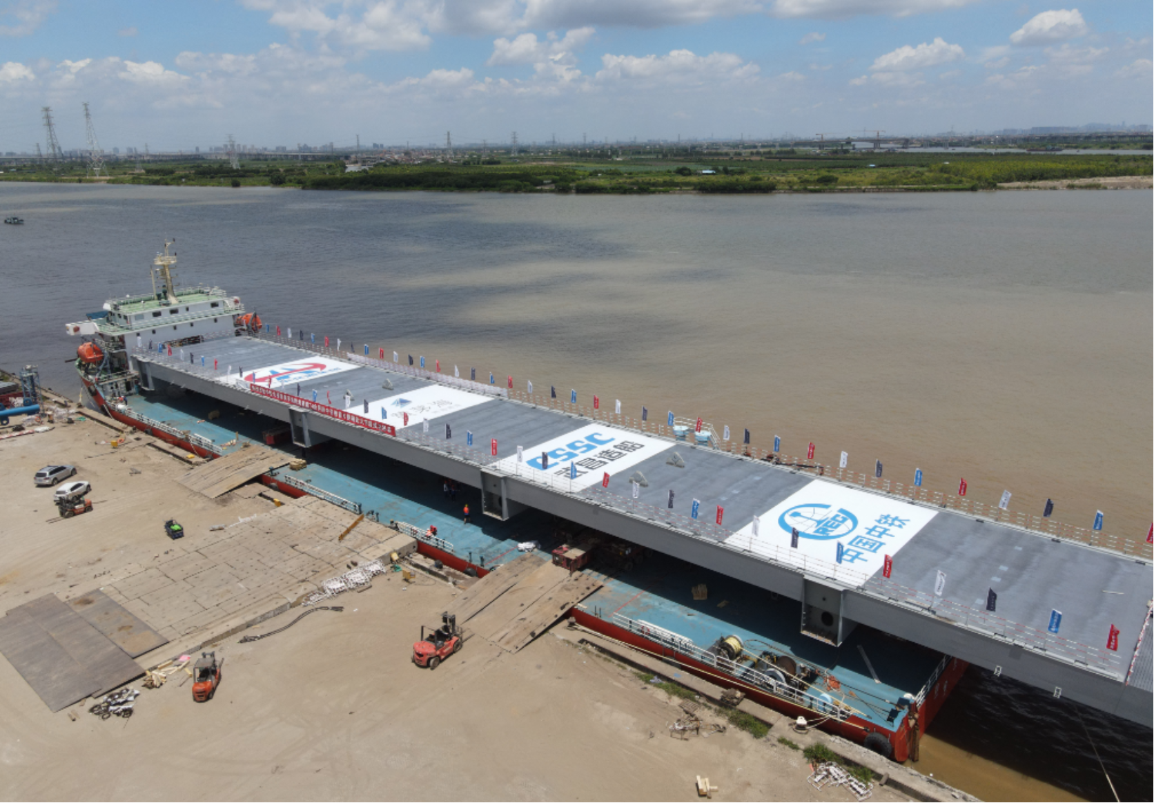 中國船舶集團武昌造船重工公司承接的黃茅??绾Mǖ繥2合同段中引橋為為1600米鋼箱連續梁橋,左右幅分離,鋼箱梁大節段共32節,現場采用半幅大節段吊裝方式進行吊裝。本次吊裝的大節段長123米、寬18.75米、高4米、重1340噸,是全橋最大、最長、最重的6節大節段之一。