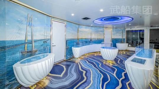 本船在理念設計方面顛覆了傳統的船舶計理念,將港珠澳大橋為主題進行深度挖掘開展主題式設計,結合室外壯闊的港珠澳大橋主體景觀、靜態的室內裝飾效果、動態的音樂渲染、情景演出以及VR互動體驗等,打造“有景”、“有夢”、“有你”的主題情景式游覽體驗。