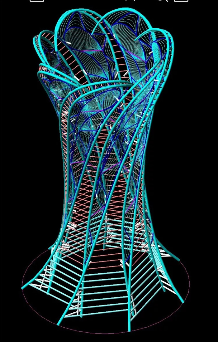 火炬塔周身“飄帶”的設計難點主要是三維扭曲的空間結構,既要確保現場數據建模十分精準,又要考慮實際施工過程中高空交叉作業等問題,所以最大程度上要避免干涉情況發生。
