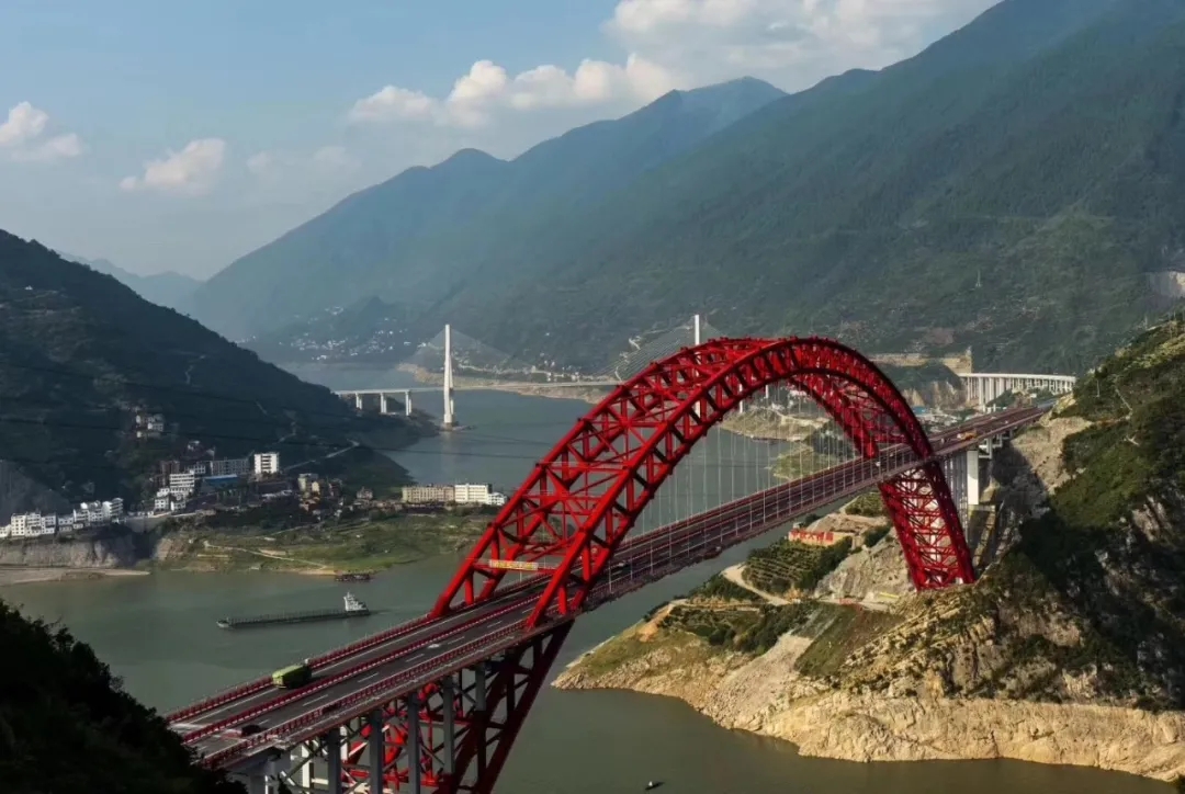 秭歸長江大橋為主跨519m中承式鋼桁架拱橋,拱肋采用空間變截面桁架式結構,桁架采用雙片主桁,上下游兩榀主桁平行布置,通過縱橫連接系栓接連接。總用鋼量約為1.72萬噸,該項目是公司承接第一座栓焊連接、大跨度鋼桁拱橋。該橋是目前世界已建成最大跨度的鋼箱桁架推力拱橋,在同類橋梁中,技術難度世界第三,凈空高度亞洲第一,整座橋主跨沒有橋墩,由23節鋼箱桁架拼起“彩虹”似的橋拱。大橋于2019年國慶前夕建成通車。