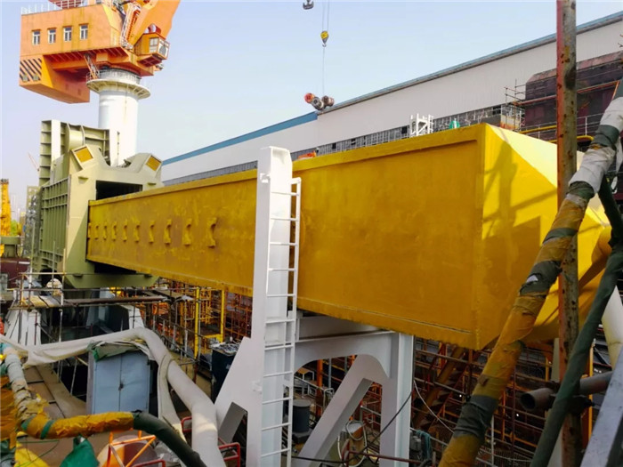項目現場安裝負責人介紹,長度35米、重110噸的巨型鋼樁與鋼樁套方孔之間的間隙不足10毫米,兩者之間的交會對接過程猶如高空“穿針引線”,難度很大。為此,模塊公司針對關鍵吊裝過程,科學設計制作了系列吊運移位和微調定位工裝,綜合起重模式動態轉換、船舶甲板位置精準裝配、空間相對位置測量等多種力量手段,長度35米的鋼樁精準穿入船艉左舷的固定鋼樁套。檢測結果顯示,鋼樁與鋼樁套間的安裝精度全面達到了技術要求。