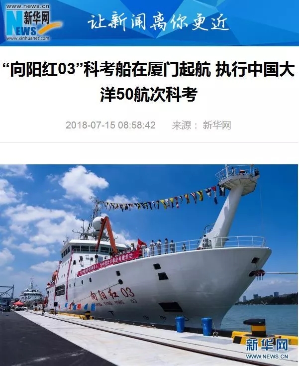 各大媒體紛紛報道的正是“向陽紅03”船出發(fā)的消息?C?C7月14日,搭載著中國大洋50航次科考隊的“向陽紅03”船從廈門起航。