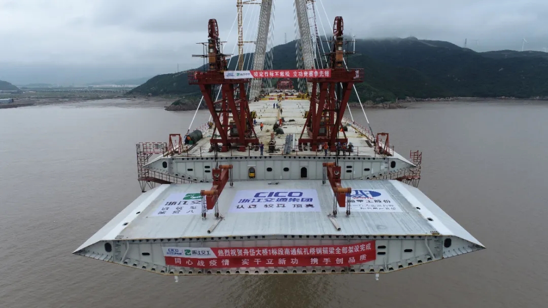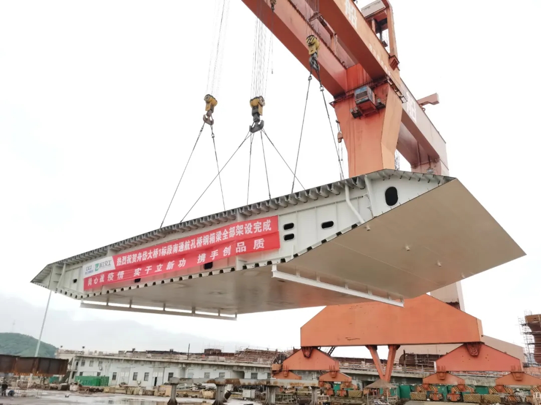 6月22日,中國(guó)船舶武船集團(tuán)武船重工股份承建的舟岱大橋DSSG01標(biāo)南通航孔橋最后一節(jié)鋼箱梁吊裝完成,精準(zhǔn)落位,南通航孔橋率先實(shí)現(xiàn)邊跨合龍,較計(jì)劃合龍時(shí)間節(jié)點(diǎn)提前了6天。